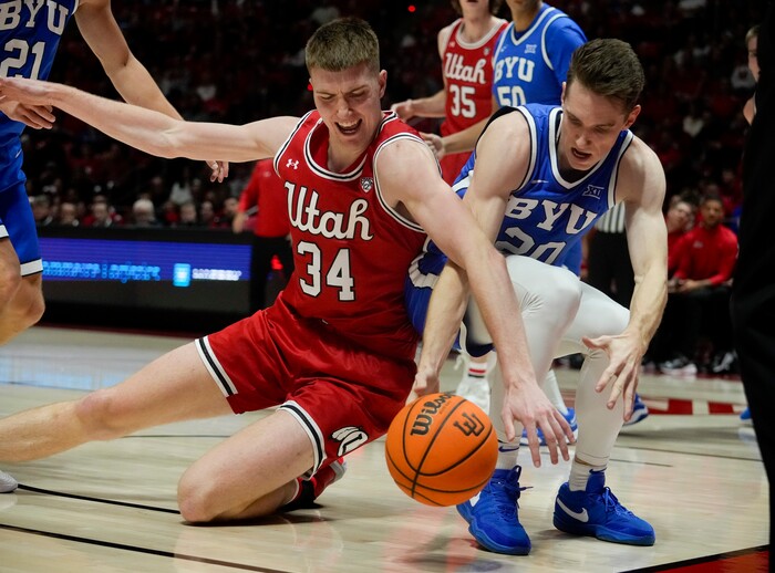 (Bethany Baker | The Salt Lake Tribune) Utah Utes center Lawson Lovering (34) and Brigham Young Cougars guard Spencer Johnson (20) fight for the ball at the Jon M. Huntsman Center in Salt Lake City on Saturday, Dec. 9, 2023.