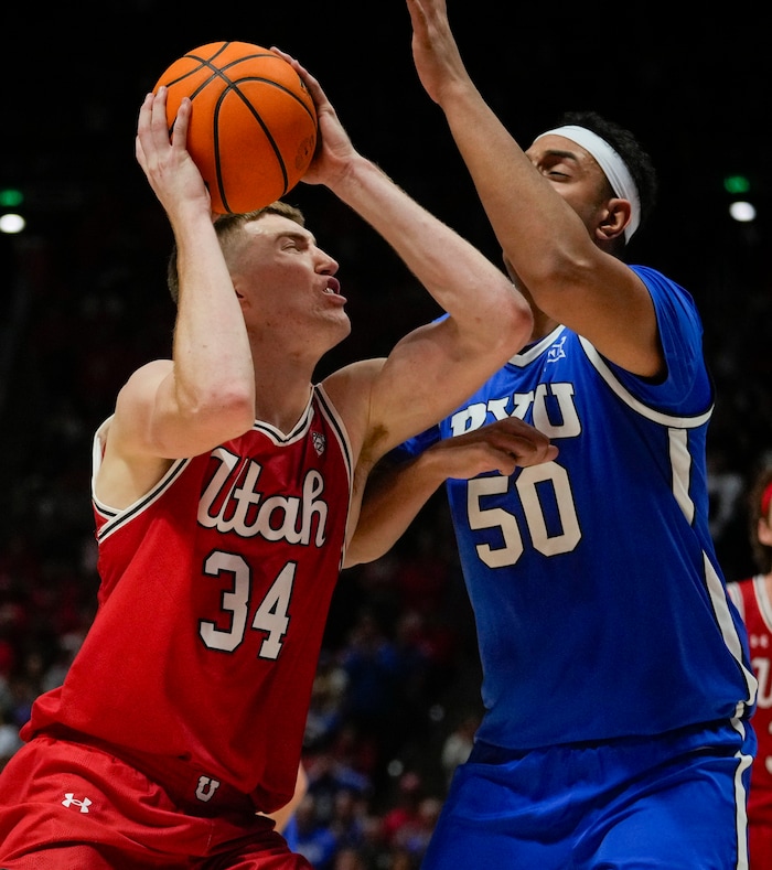 (Bethany Baker | The Salt Lake Tribune) Utah Utes center Lawson Lovering (34) shoots as Brigham Young Cougars center Aly Khalifa (50) defends at the Jon M. Huntsman Center in Salt Lake City on Saturday, Dec. 9, 2023.