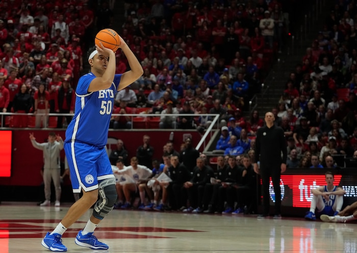 (Bethany Baker | The Salt Lake Tribune) Brigham Young Cougars center Aly Khalifa (50) shoots a three point basket against the Utah Utes at the Jon M. Huntsman Center in Salt Lake City on Saturday, Dec. 9, 2023.