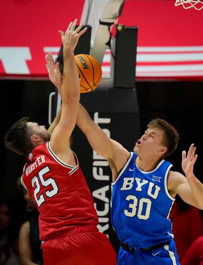 (Bethany Baker | The Salt Lake Tribune) Utah Utes guard Rollie Worster (25) shoots as Brigham Young Cougars guard Dallin Hall (30) blocks at the Jon M. Huntsman Center in Salt Lake City on Saturday, Dec. 9, 2023.