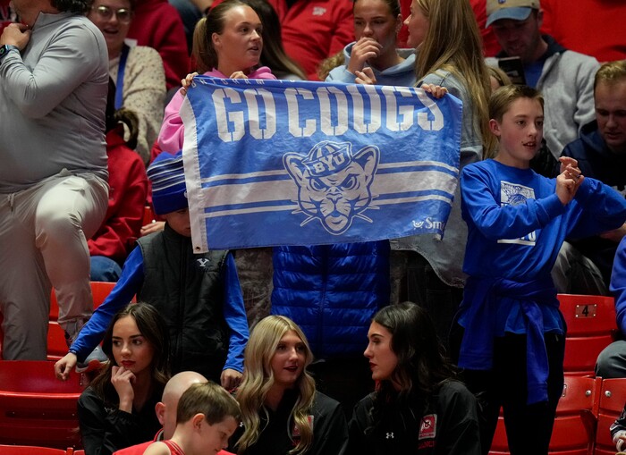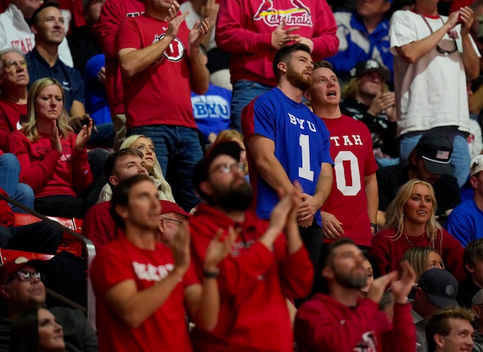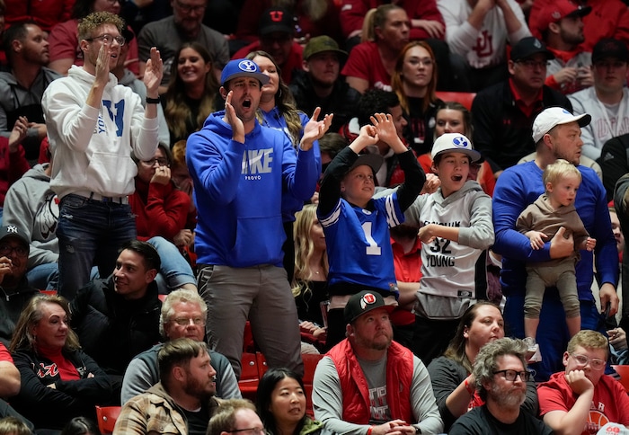 (Bethany Baker | The Salt Lake Tribune) Brigham Young Cougars fans cheer during the game against the Utah Utes at the Jon M. Huntsman Center in Salt Lake City on Saturday, Dec. 9, 2023.