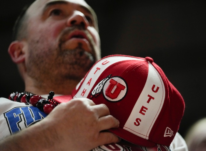 (Bethany Baker | The Salt Lake Tribune) A Utah Utes fan stands during the National Anthem at the Jon M. Huntsman Center in Salt Lake City on Saturday, Dec. 9, 2023.