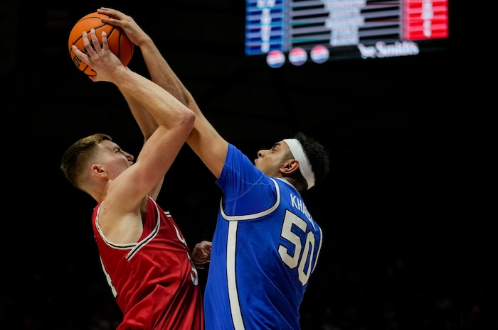 (Bethany Baker | The Salt Lake Tribune) Brigham Young Cougars center Aly Khalifa (50) blocks a shot by Utah Utes center Lawson Lovering (34) at the Jon M. Huntsman Center in Salt Lake City on Saturday, Dec. 9, 2023.