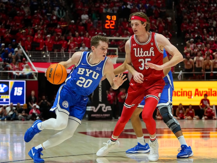 (Bethany Baker | The Salt Lake Tribune) Brigham Young Cougars guard Spencer Johnson (20) drives to the basket as he is defended by Utah Utes center Branden Carlson (35) at the Jon M. Huntsman Center in Salt Lake City on Saturday, Dec. 9, 2023.