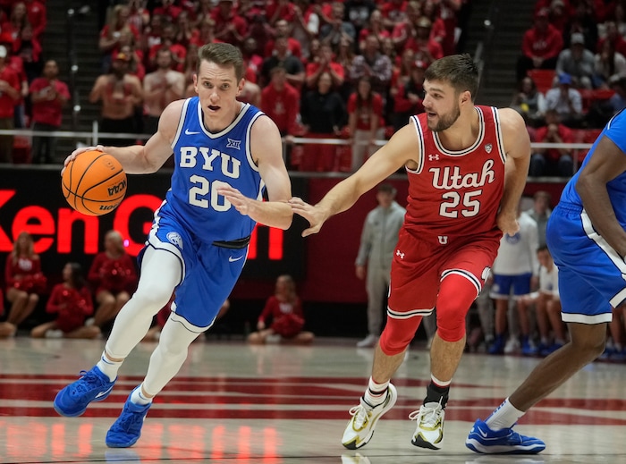 (Bethany Baker | The Salt Lake Tribune) Brigham Young Cougars guard Spencer Johnson (20) is defended by Utah Utes guard Rollie Worster (25) at the Jon M. Huntsman Center in Salt Lake City on Saturday, Dec. 9, 2023.