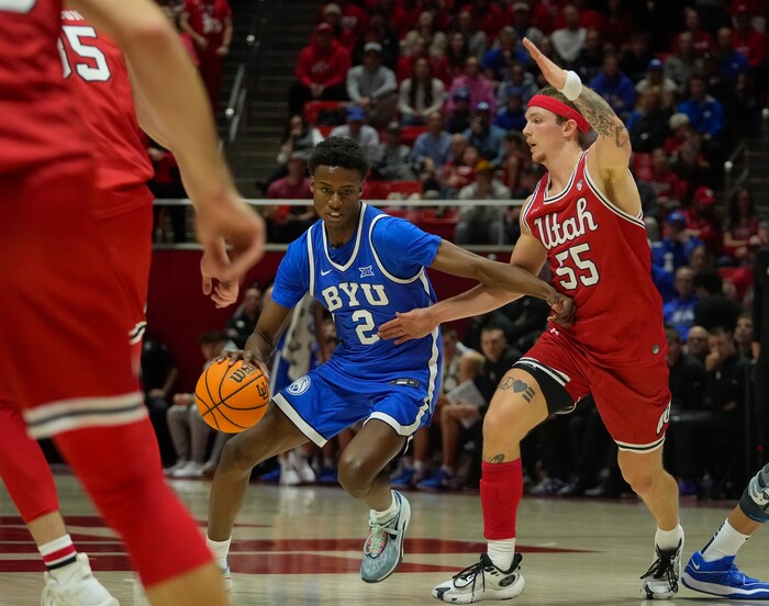 (Bethany Baker | The Salt Lake Tribune) Brigham Young Cougars guard Jaxson Robinson (2) drives to the basket as Utah Utes guard Gabe Madsen (55) defends at the Jon M. Huntsman Center in Salt Lake City on Saturday, Dec. 9, 2023.