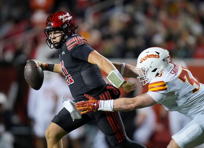 (Bethany Baker | The Salt Lake Tribune) Utah Utes quarterback Isaac Wilson (11) looks to pass as he avoids a tackle from Iowa State Cyclones linebacker Jack Sadowsky V (33) during the game at Rice-Eccles Stadium in Salt Lake City on Saturday, Nov. 23, 2024.